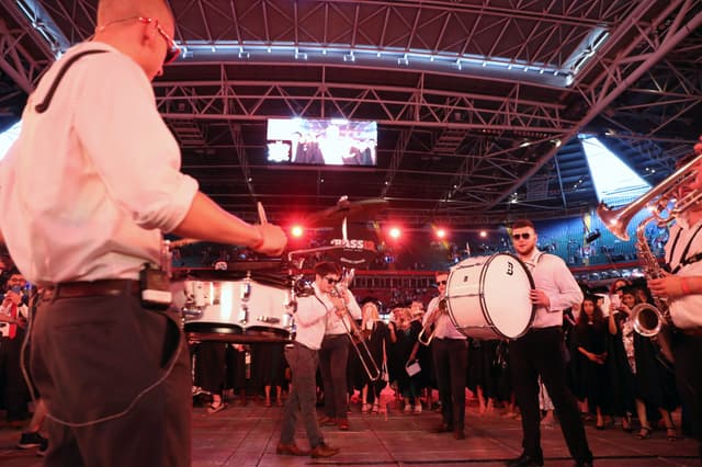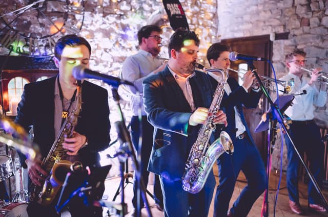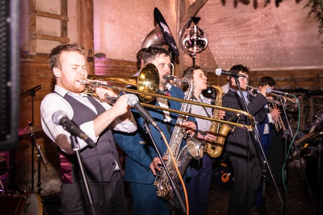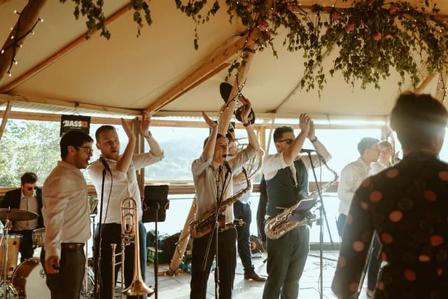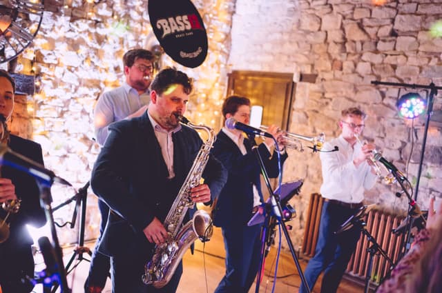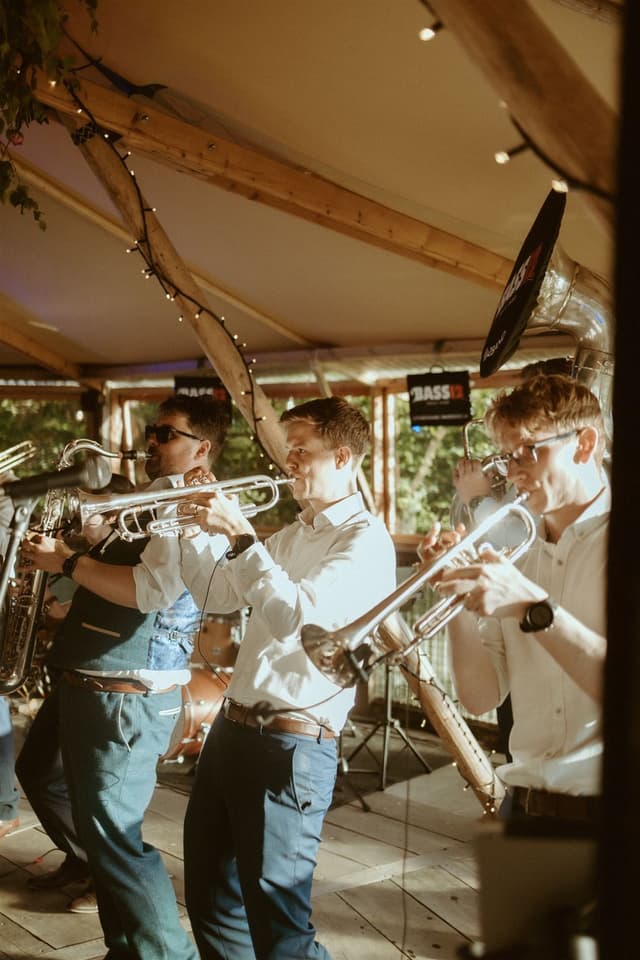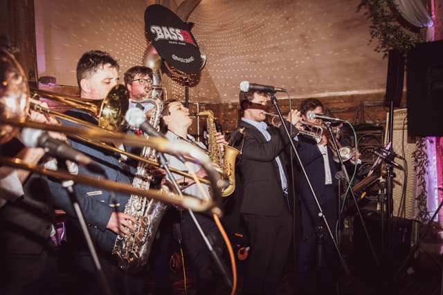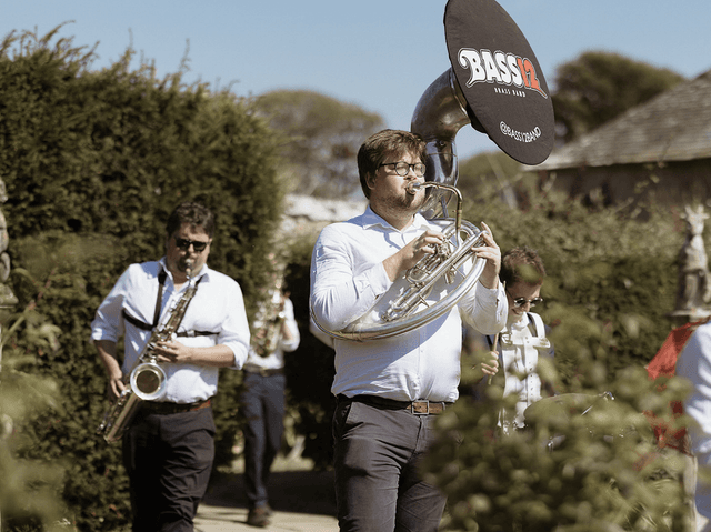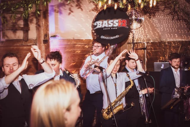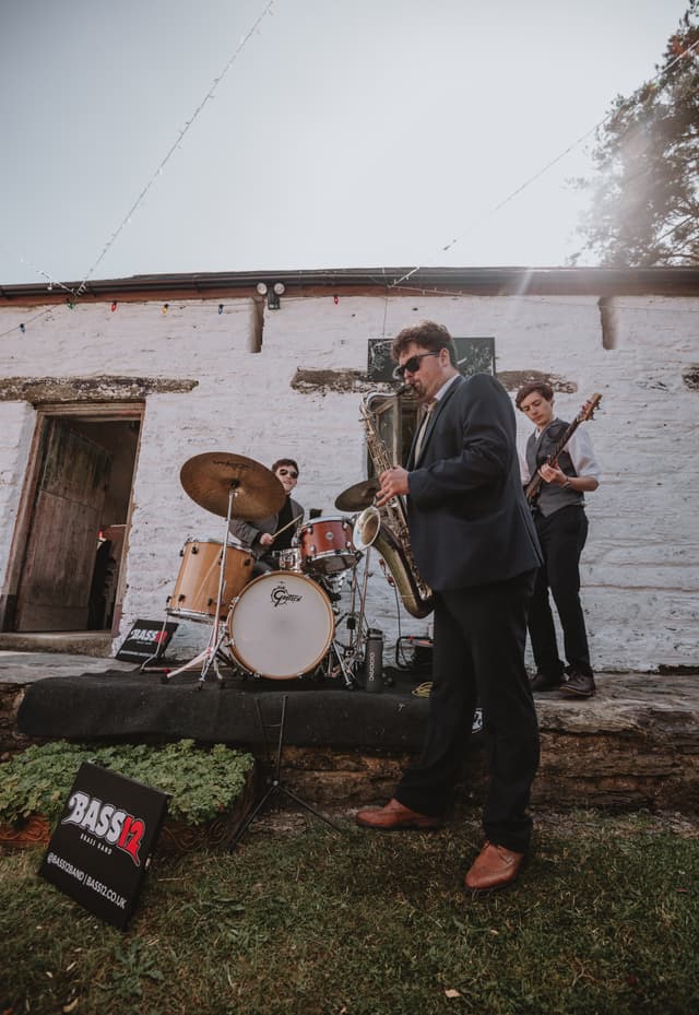 We booked a 5-piece version of Bass12 as a surprise for our guests following our wedding ceremony and they didn't disappoint! They held back and set up in secret and played across our reception drinks. They were the perfect party-starter for a joyful day and had everyone clapping and dancing along (several hours before I think most people expected to be!) - we've had so many guests mention Bass12 as a highlight of the day. The communication was really clear and Mark listened and advised us along the way, and ended up creating exactly what we imagined. Thanks so much!