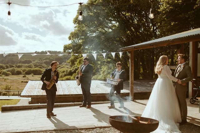 The two evening sets, performed in a giant tipi were brilliant, including our first dance which they did a special arrangement for. The band have an infectious energy which they maintain the whole evening and it is infectious. They got everyone dancing, young and old and nobody wanted it to end! We have been to lots of weddings and I know we are biased as this was our wedding but they were the best band we have seen at a wedding! All our guests could not stop raving about them!